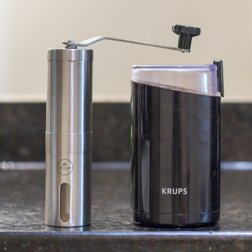 I have two coffee grinders at home that I wanted to compare. A hand burr grinder, and an electric blade grinder. Burr grinders are designed to give you a more consistent grind size, since each bean only passes through the mechanism once; as opposed to blade grinders which just chop beans willy-nilly. America’s Test kitchen recommends pulsing blade grinders in 1-second intervals to get the best results. So does this actually work?