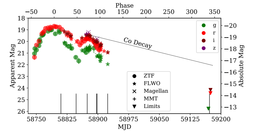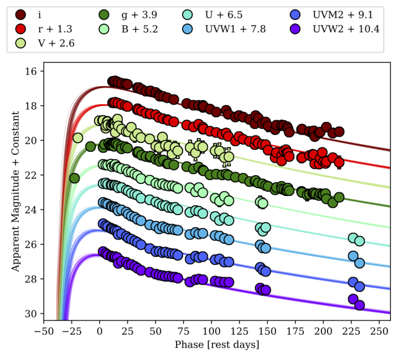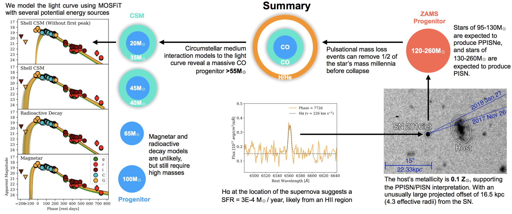 SN2016iet was a supernova discovered back in 2016 by the Gaia space mission. We’ve been following the supernova in the optical ever since, collecting photometry and spectroscopy to track its evolution. This turned out to be a peculiar supernova for many reasons: A very long lasting light curve still visible 700 days after explosion; a surprisingly large offset from its host galaxy; and models which suggest a progenitor star of 150-260 solar masses.